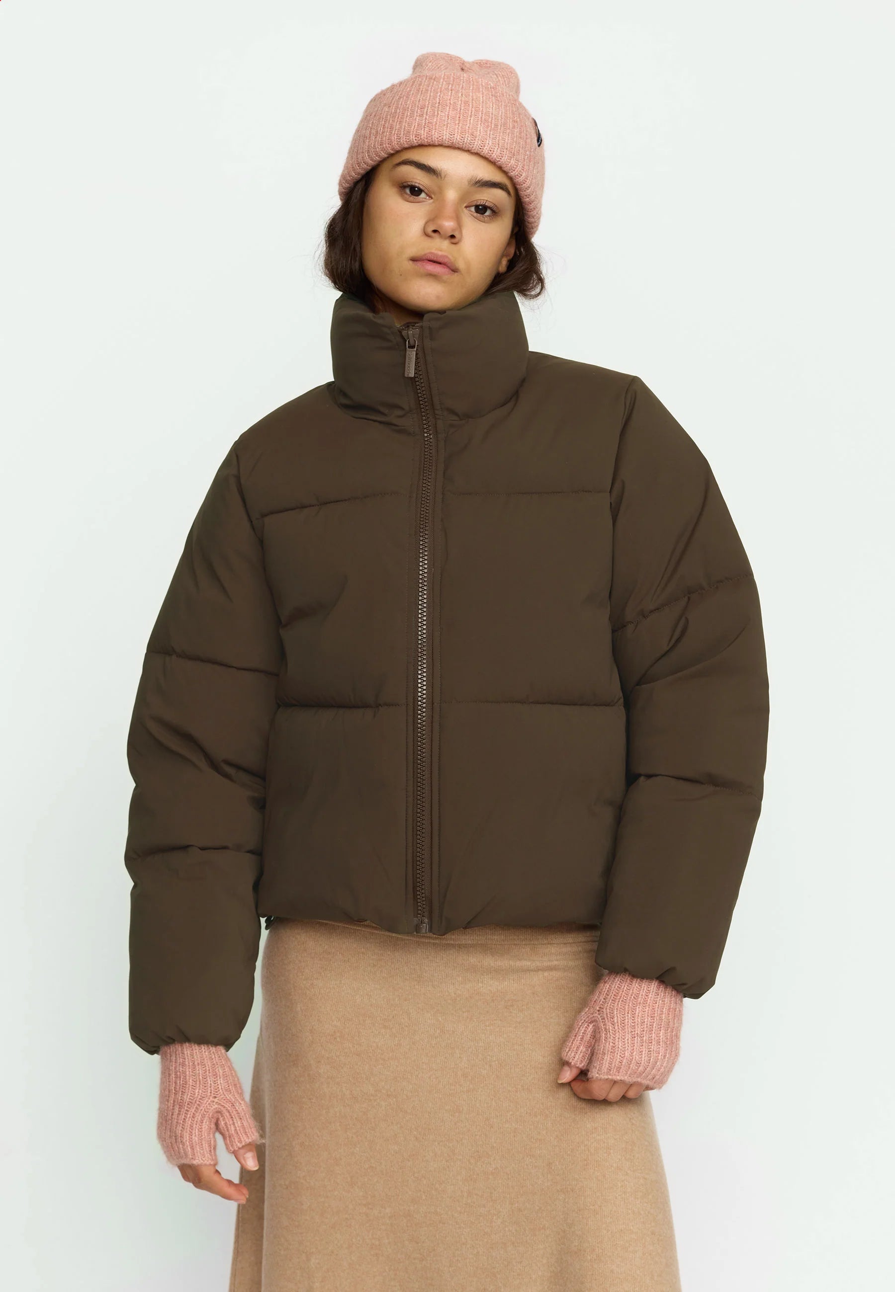 Puffer jacket in a subtle cropped design, made of a thin stretchable recycled polyester fabric. The puffer jacket is made with a bold tone in tone Vislon zipper, a standup collar, and an adjustable bottom hemline. The side-pockets with hidden zippers are lined with warm fleece lining for extra comfort. The water-repellent Teflon EcoElite coating is environmentally friendly, free of harmful fluorocarbon. The warm and highly compressible insulation is a DuPont Sorona Padding, a fiber partially made with renewable plant-based ingredients and produced with particular attention towards the environment.