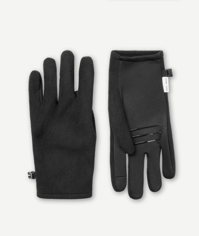 Technical gloves. Screen fingertips on thumb and index finger. Anti-slip detailing at the palm. Pairing hook at the sides. Samsøe Samsøe branded label on the right glove.