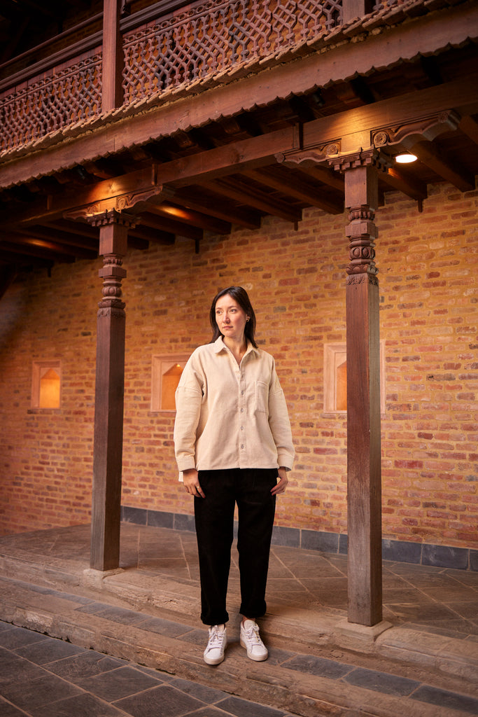 The Arniko Tahira Shirt in black corduroy. The Tahira shirt is a classic Arniko favourite. The shirt is loved for its timeless button-down and oversized design, which ensures comfort and style. This piece from the Tahira collection features a corduroy fabric in a black colour, making it a great addition to any outfit. The Tahira Shirt is versatile enough for casual outings or dressier occasions. Sustainably produced in Kathmandu, Nepal.