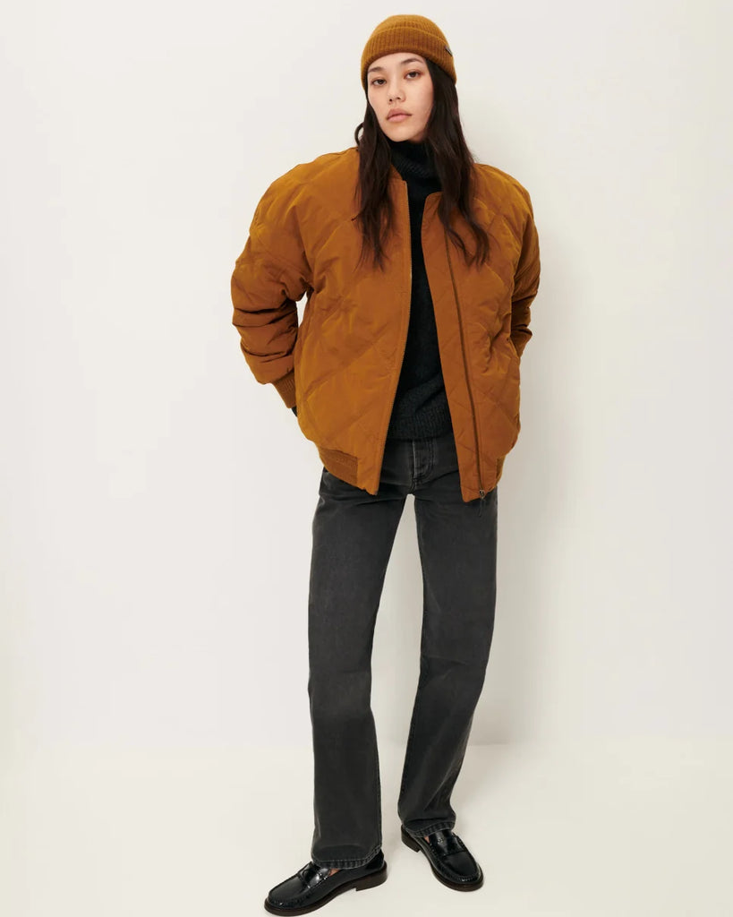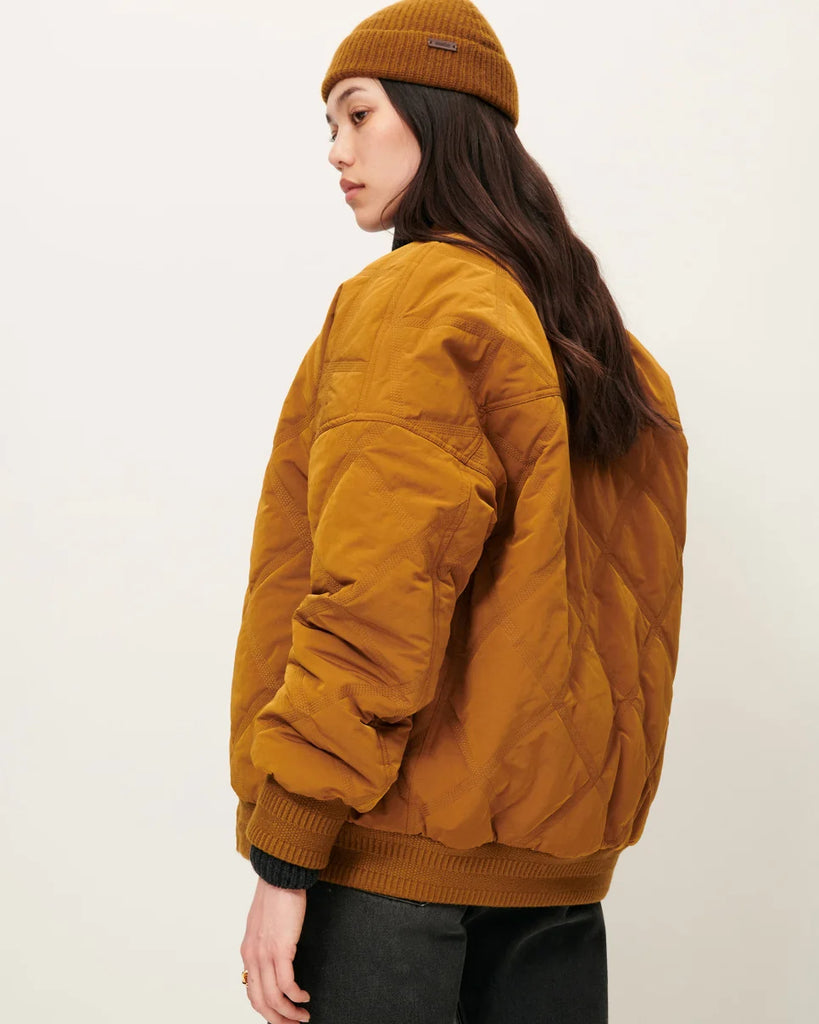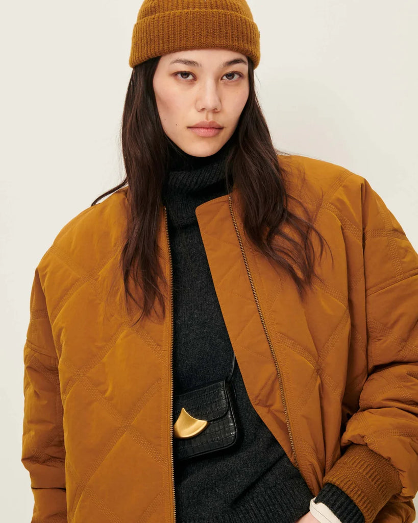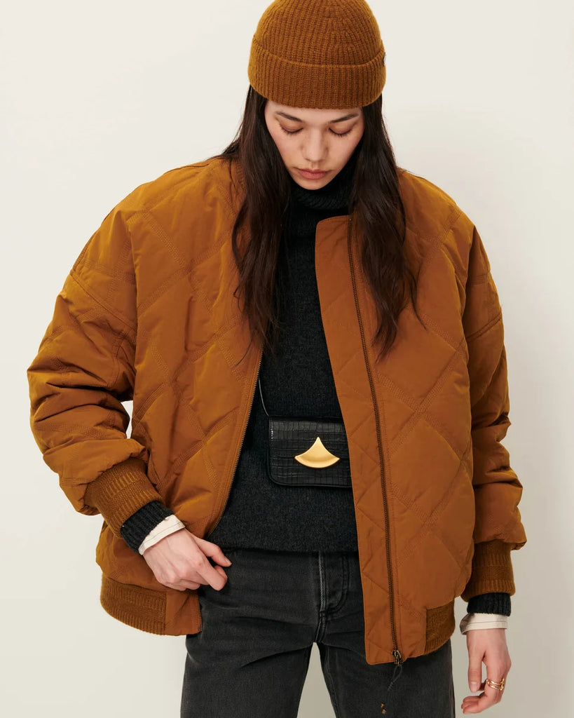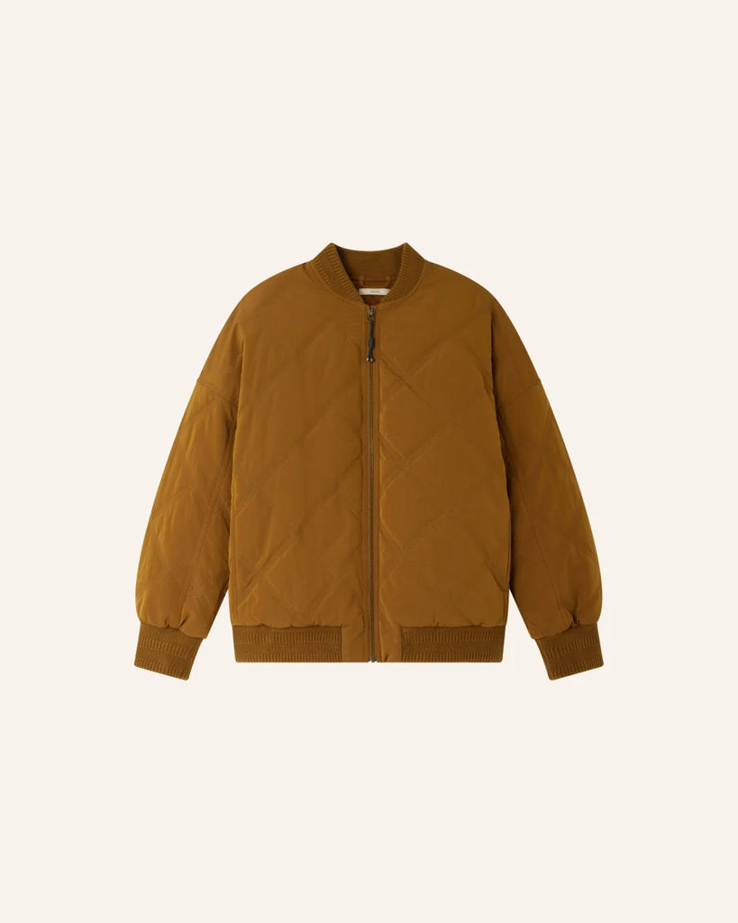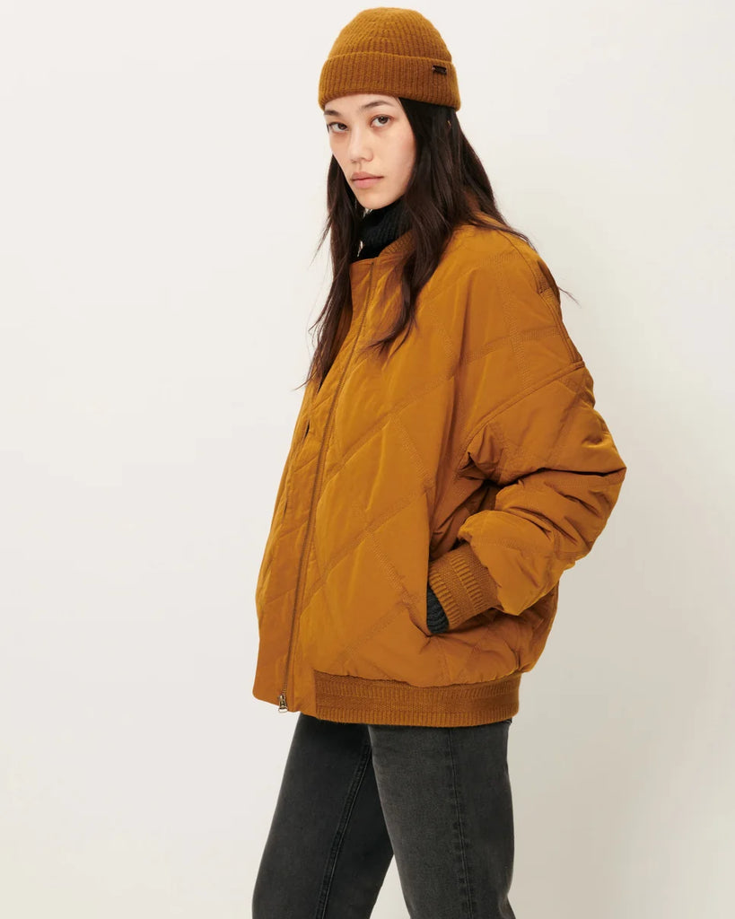 Oversized quilted bomber jacket in lightweight padded shower-resistant nylon with fancy ribbing at hem, cuffs and collar.