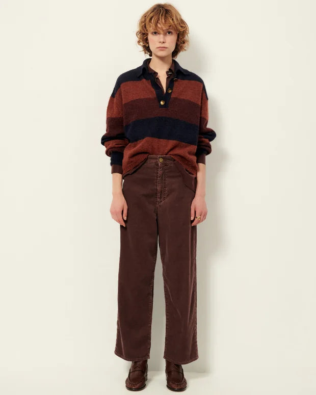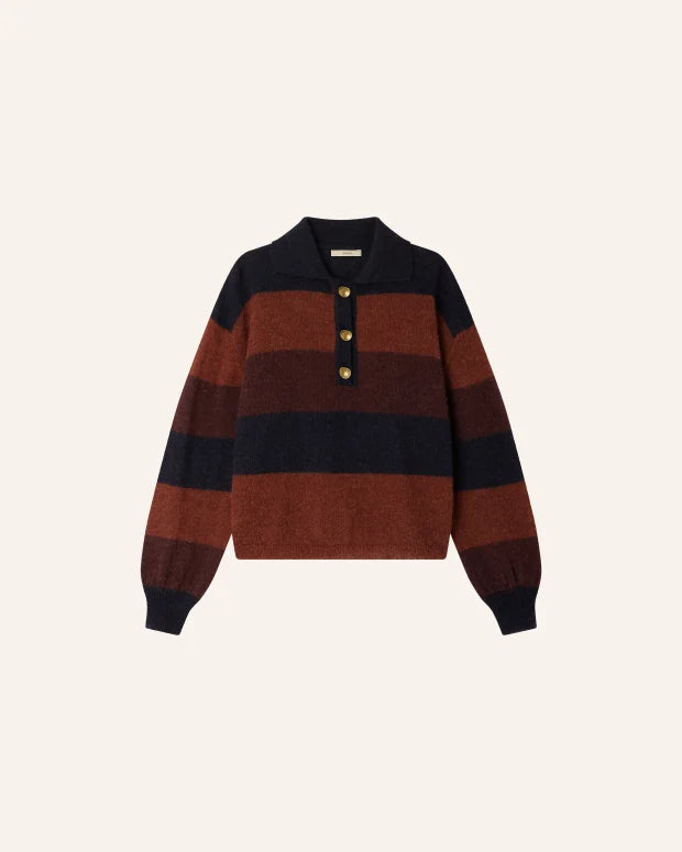 Striped long-sleeve polo-style sweater in a fluffy jersey knit, knitted in Italy.