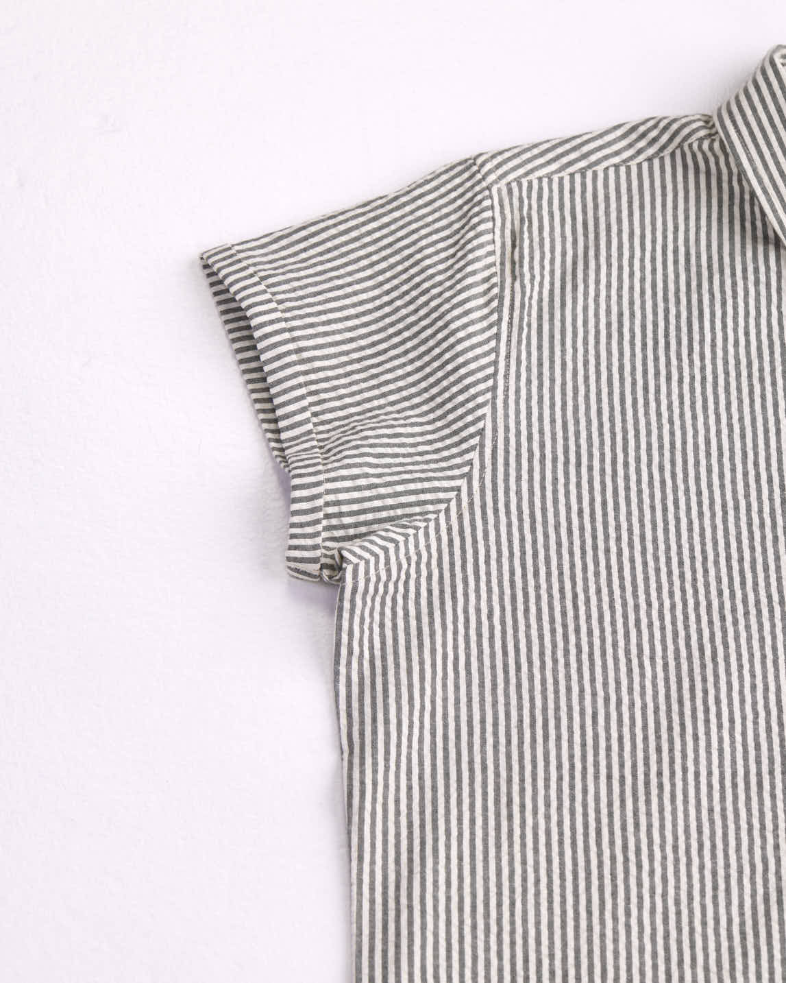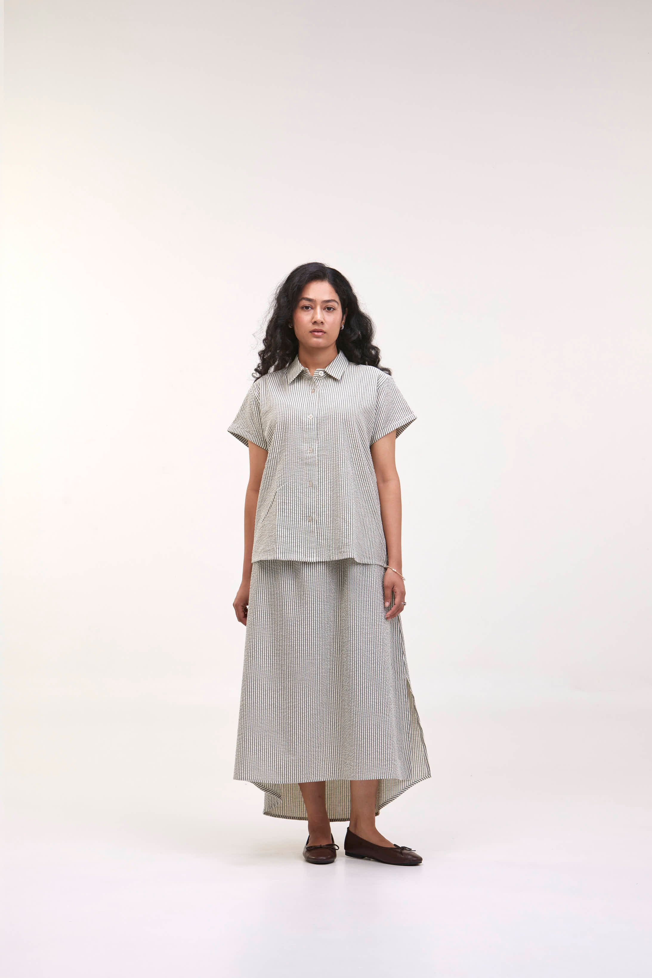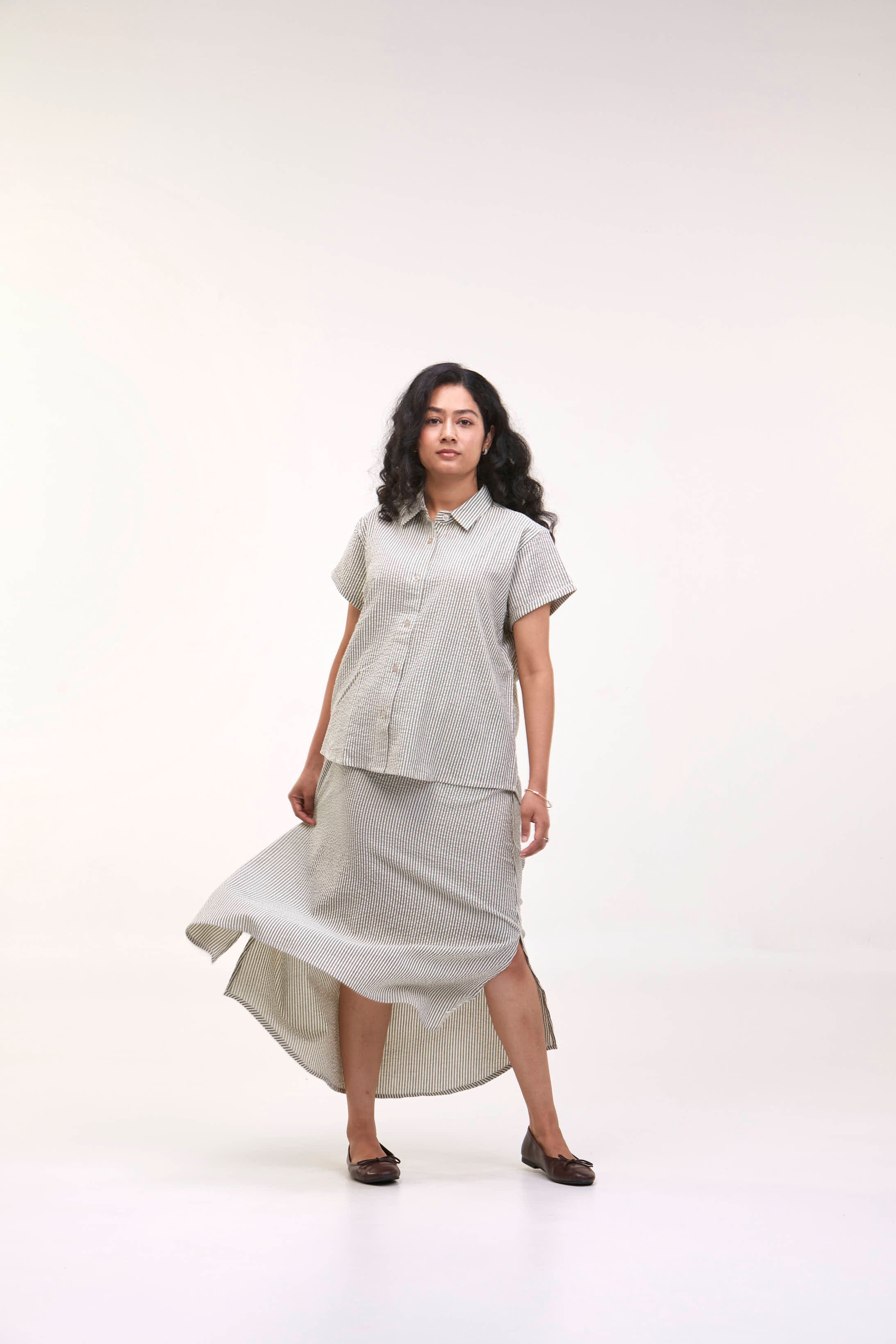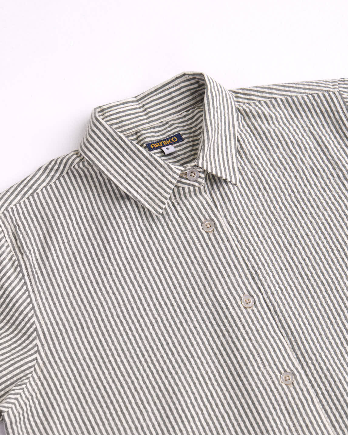 The Arniko Jo Shirt in green/white seersucker. Made from 100% organic cotton seersucker, the Jo Shirt is light, breathable, and designed for comfort. The puckered texture lifts the fabric off the skin for better airflow. Finished with a classic collar and full button front, it’s a versatile warm-weather staple. Sustainably produced in Kathmandu, Nepal.
