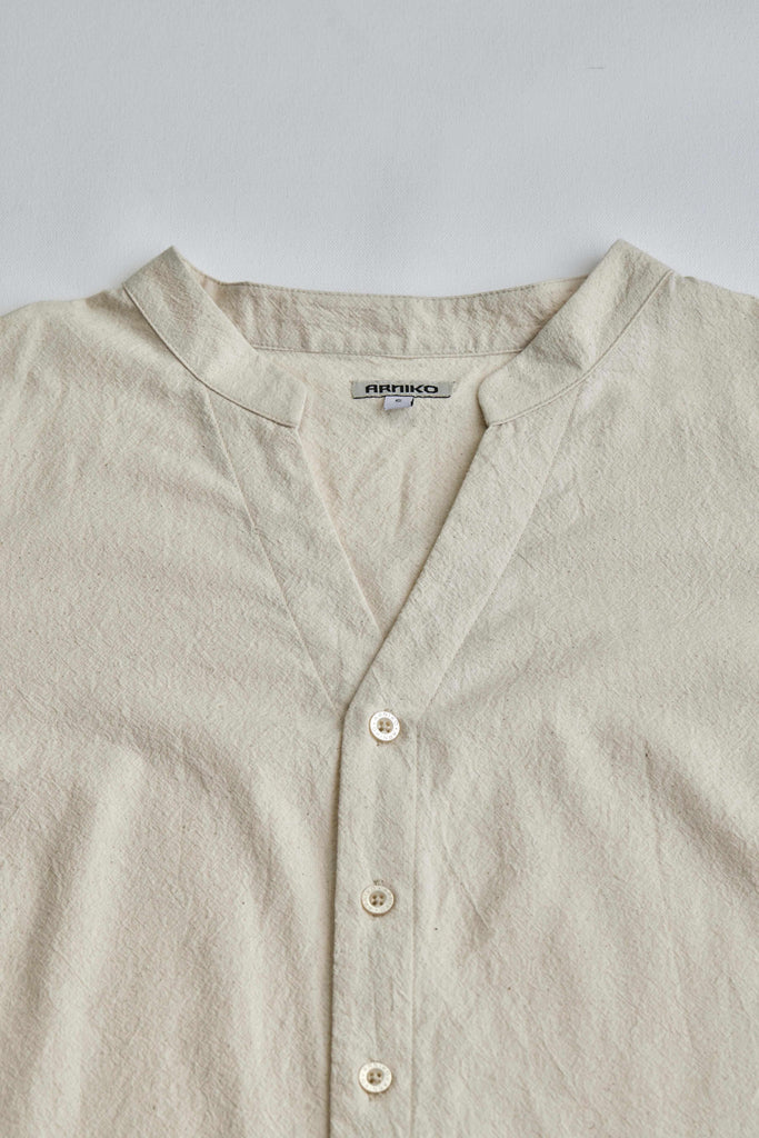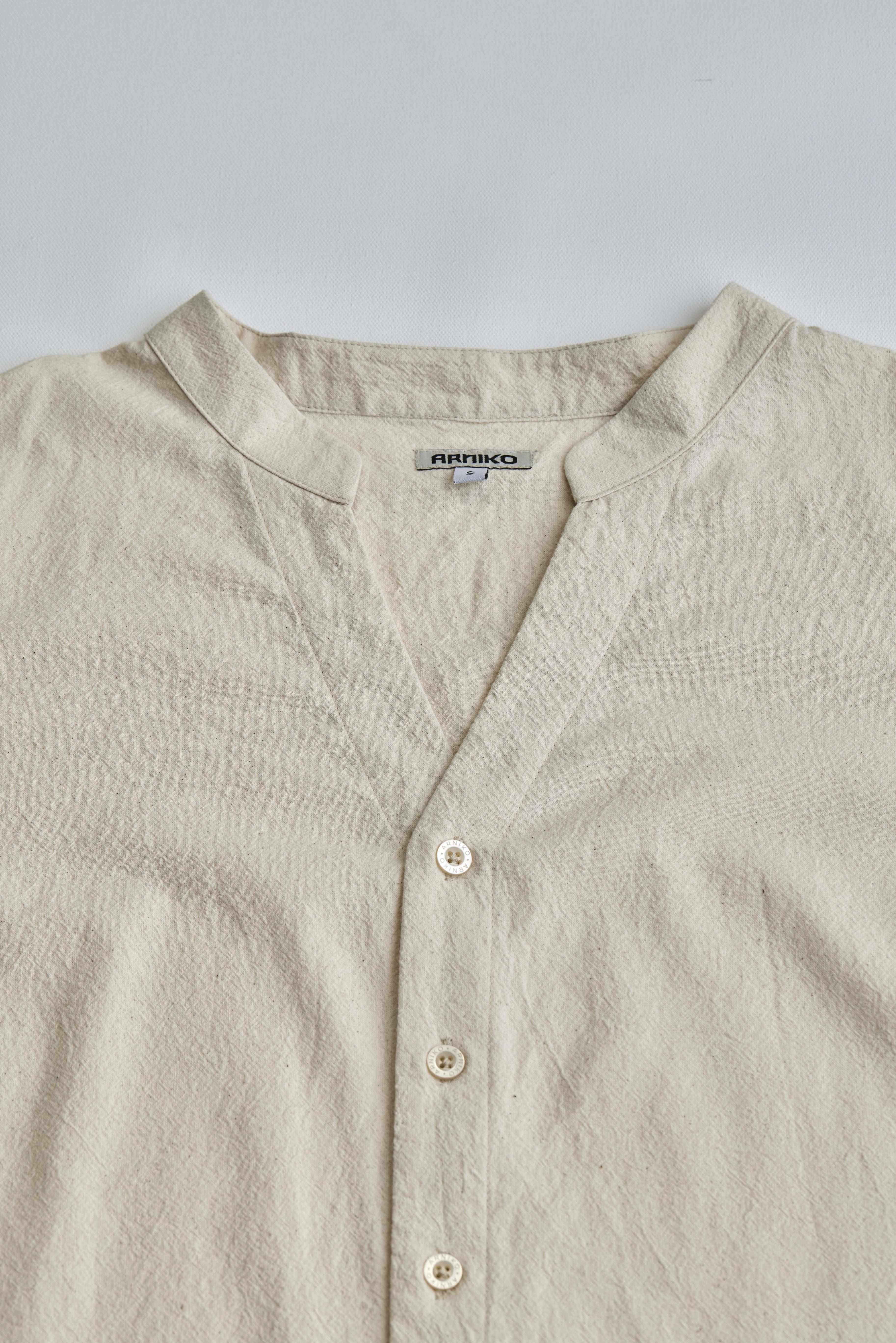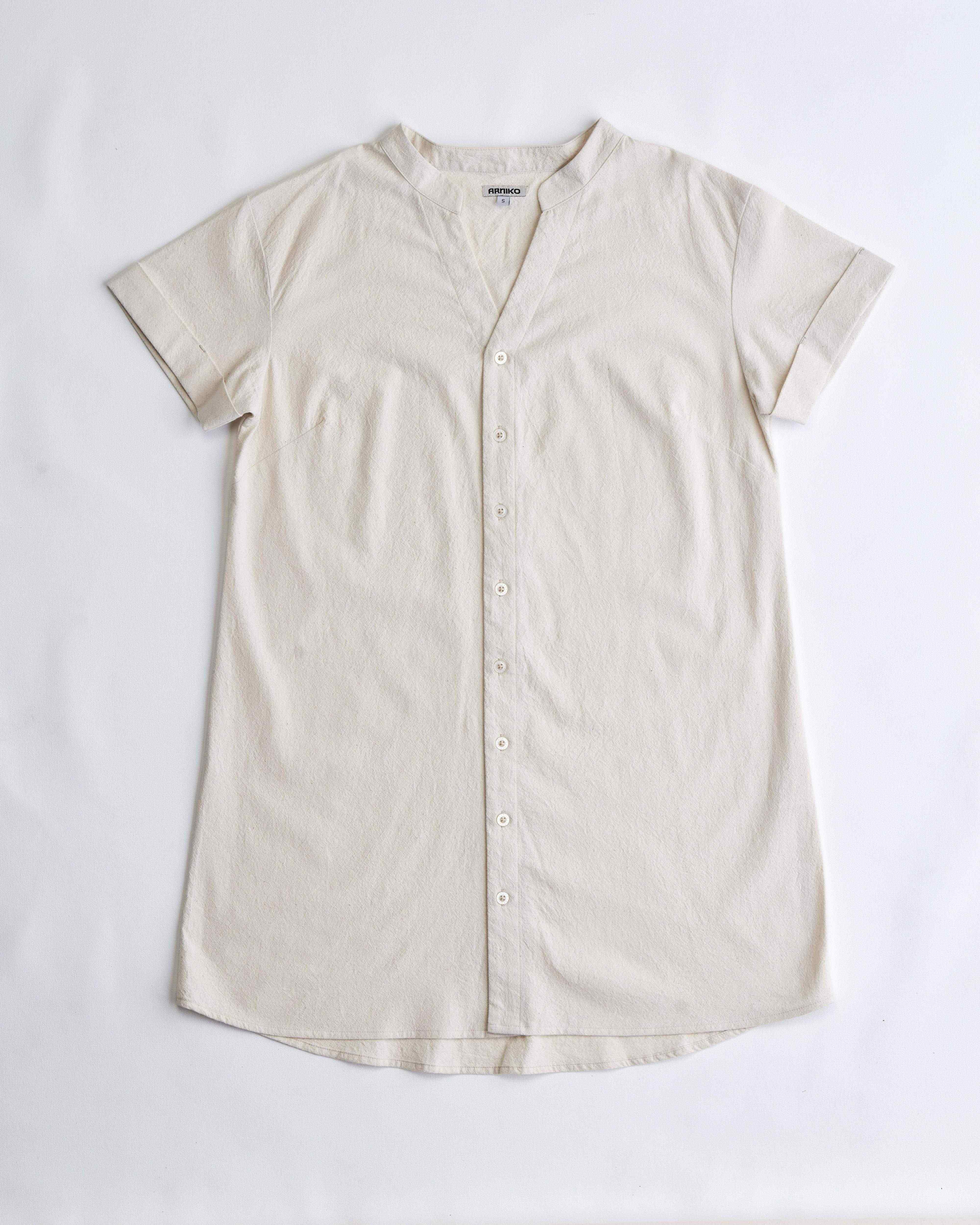 The Arniko Jo Dress in off white. Made from 100% organic cotton, the Jo Dress is soft and breathable - perfect for warm weather. It features a relaxed fit with short sleeves, a button-down front, and a band collar for a clean, modern look. Sustainably produced in Kathmandu, Nepal.